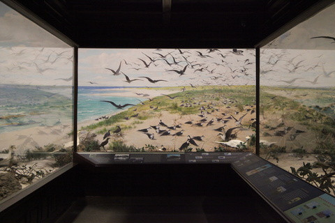 Created in 1914, the Laysan Island Cyclorama immerses visitors in the environment of Kauō (or Laysan), an atoll in the Northwest Hawaiian Islands known for its extraordinary bird populations. Combining art, science, and conservation, the exhibition features a 138-foot painted mural, over 100 mounted birds representing 24 species (including 3 now extinct species), and a richly detailed foreground of nests, eggs, and native flora. It was one of the first 360-degree immersive exhibits (panorama or cyclorama) dedicated to a singular ecosystem and remains unique in the world today.